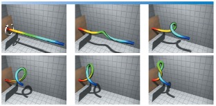 Fig. Torsional buckling of a filament simulated from our computational rod model. For the video animation, refer to the youtube video: https://youtu.be/bGAQ-5wBYiQ. |